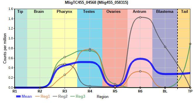 | 15. | MligTC455_37741 | 69 | 1.44 | Mlig455_059307, Mlig455_065197 | Neo: Irradiation Age: Up-Down-Down Region-specific R4: 6.851 Region-enriched R2: 6.435/0.04973 Regeneration-upregulated R3: 7.677 Regeneration-enriched R3: 7.677 |