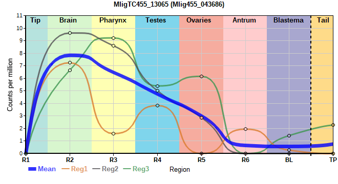 | 14. | MligTC455_48595 | 503 | 10.48 | Mlig455_017699 | Neo: - Age: - Region-enriched R6: 1.813/0.03812 Regeneration-downregulated R6: -2.325 Regeneration-depleted R6: -2.325 |