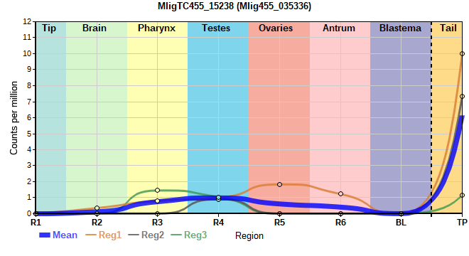 | 3. | MligTC455_53341 | 1321 | 27.52 | Mlig455_026459, Mlig455_044751 | Neo: - Age: - Region-enriched R7: 7.097/0.00000 Regeneration-downregulated BL: -10.182 Regeneration-depleted BL: -10.182 |