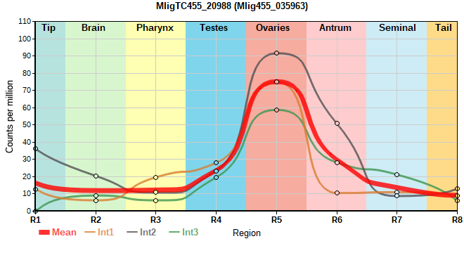 | 5. | MligTC455_47726 | 1983 | 41.3 | Mlig455_021500, Mlig455_063198 | Neo: Neoblast, stringent Age: - Region-enriched R5: 1.718/0.00000 |