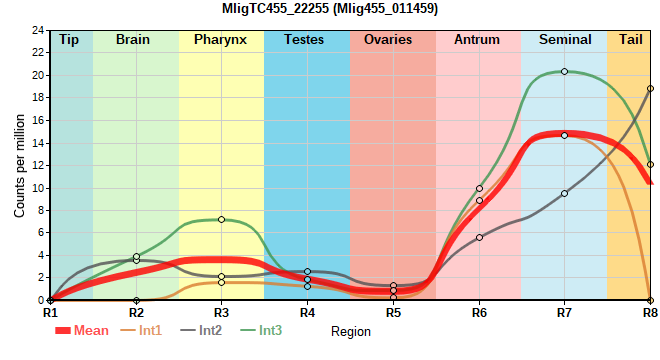 | MligTC455_22255 | 214 | 4.46 | Mlig455_011459, Mlig455_011544 | Neo: - Age: - Region-enriched R7: 3.036/0.00377 Regeneration-downregulated R6: -3.902 Regeneration-depleted R6: -3.902 |