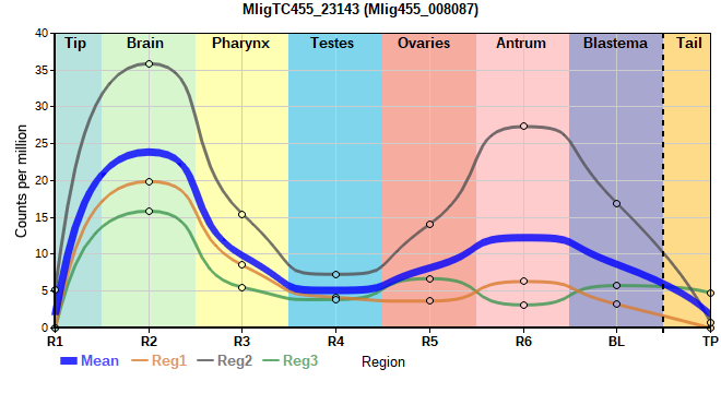 | 51. | MligTC455_45414 | 4030 | 83.95 | Mlig455_045096 | Neo: - Age: Down-Down-Up Region-specific R2: 2.245 Region-enriched R2: 1.386/0.00025 Regeneration-depleted TP: -1.938 |