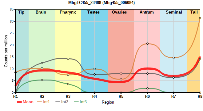 | 3. | MligTC455_34621 | 182 | 3.8 | Mlig455_049282, Mlig455_050627 | Neo: - Age: Down-Up-Down Region-enriched R2: 4.682/0.00001 |