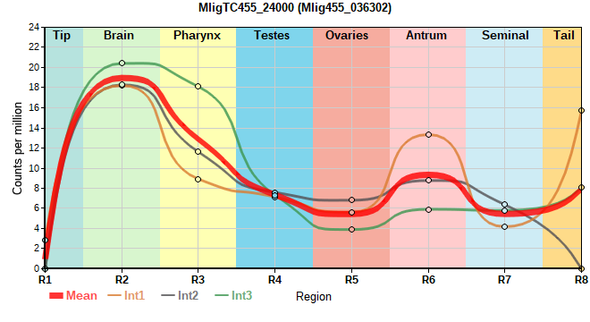 | 6. | MligTC455_53778 | 951 | 19.82 | Mlig455_007965, Mlig455_015595 | Neo: - Age: Down-Up-Down, logFC(26M/2M)=-0.392 Region-enriched R4: 2.645/0.00192 |