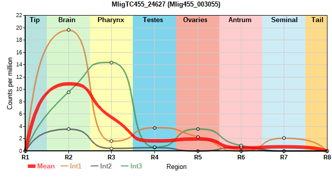 | 11. | MligTC455_20900 | 185 | 3.85 | Mlig455_016663, Mlig455_056352, Mlig455_056364 | Neo: - Age: logFC(26M/2M)=0.440 Region-enriched R3: 6.081/0.00000 |