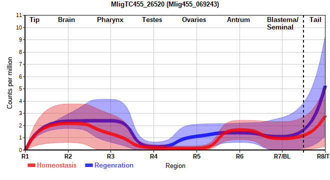 | 11. | MligTC455_53638 | 2333 | 48.59 | Mlig455_051726 | Neo: - Age: Down-Up-Up Region-enriched R8: 2.691/0.00000 Regeneration-downregulated BL: -2.953 Regeneration-depleted BL: -2.953 |