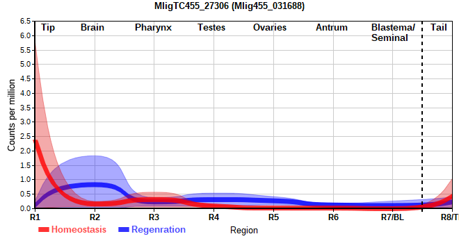 | 17. | MligTC455_19552 | 288 | 6 | Mlig455_055936, Mlig455_068188 | Neo: - Age: Down-Up-Up, logFC(26M/2M)=0.424 Region-specific R2: 6.302 Region-enriched R2: 4.919/0.00633 Regeneration-depleted R4: -5.607 |