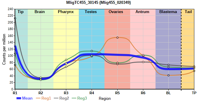 | 3. | MligTC455_47920 | 6293 | 131.1 | Mlig455_042731 | Neo: Neoblast, stringent Age: Down-Up-Up Region-enriched R5: 1.693/0.00000 Regeneration-enriched TP: 1.784 |