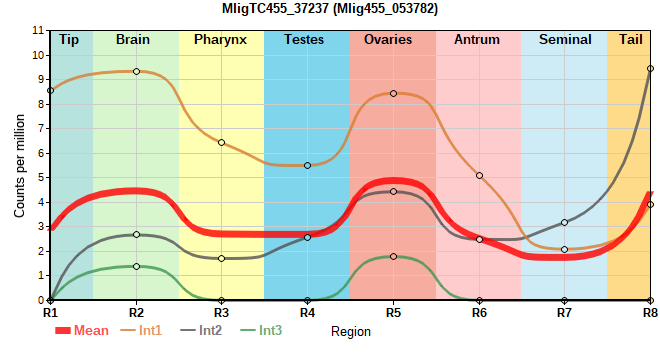 | 62. | MligTC455_15888 | 446 | 9.29 | Mlig455_056804, Mlig455_056842 | Neo: Int S/G2/M Age: - Region-enriched R5: 2.356/0.00867 |