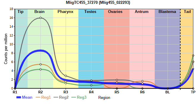 | 5. | MligTC455_35960 | 7399 | 154.16 | Mlig455_026549, Mlig455_026639 | Neo: - Age: - Region-enriched R2: 2.367/0.00000 Regeneration-downregulated BL: -2.261 Regeneration-depleted BL: -2.261 |