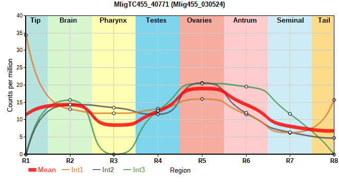 | 6. | MligTC455_48665 | 436 | 9.08 | Mlig455_026552, Mlig455_026641 | Neo: - Age: Down-Up-Down |
