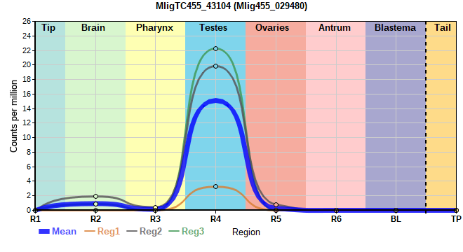 | MligTC455_43104 | 713 | 14.85 | Mlig455_029480, Mlig455_029501 | Neo: Irradiation Age: - Region-specific R4: 5.994 Region-enriched R4: 3.831/0.00009 Regeneration-downregulated R4: -3.137 Regeneration-depleted R4: -3.137 |