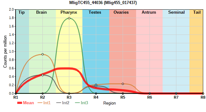 | 8. | MligTC455_36827 | 1491 | 31.06 | Mlig455_019318, Mlig455_019433 | Neo: - Age: Down-Up-Up, logFC(26M/2M)=0.416 Region-enriched R3: 6.481/0.00001 |