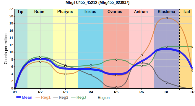 | 28. | MligTC455_48028 | 185 | 3.85 | Mlig455_007274 | Neo: - Age: Down-Up-Down Regeneration-upregulated BL: 4.108 Regeneration-enriched BL: 4.108 |