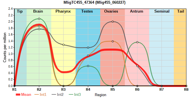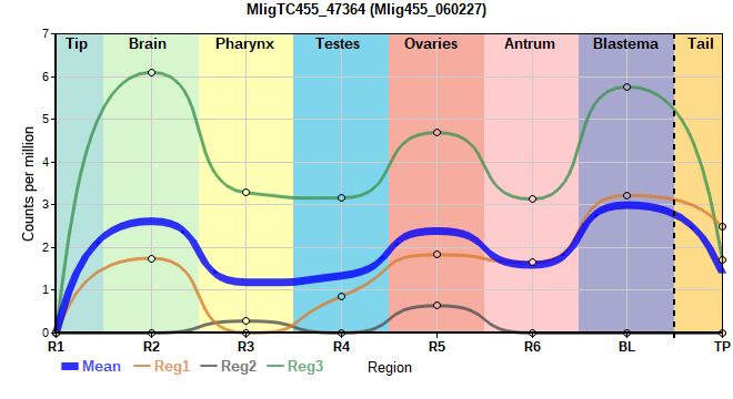 | 8. | MligTC455_20231 | 57 | 1.19 | Mlig455_053859 | Neo: - Age: Down-Up-Up Regeneration-downregulated R4: -5.496 Regeneration-depleted R4: -5.496 |